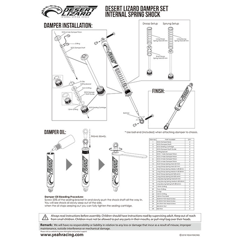 Introducing the Yeah Racing Desert Lizard internal spring shock for crawlers, comes pre-assembled for easy upgrading your current rig! Comes with a full set of springs and machined pistons for you to setup your rig for all sorts of different conditions! Included are springs for you to build either a droop or a sprung setup, a sprung setup will create a rig which will generate a lot of flex and more suspension travel. For the droop setup, your rig will sit lower and because of a spring under the piston, will be less prone to rolling over but will generate less flex. Featuring a triple O-Ring sealing cartridge which will prevent shock oil leakage!