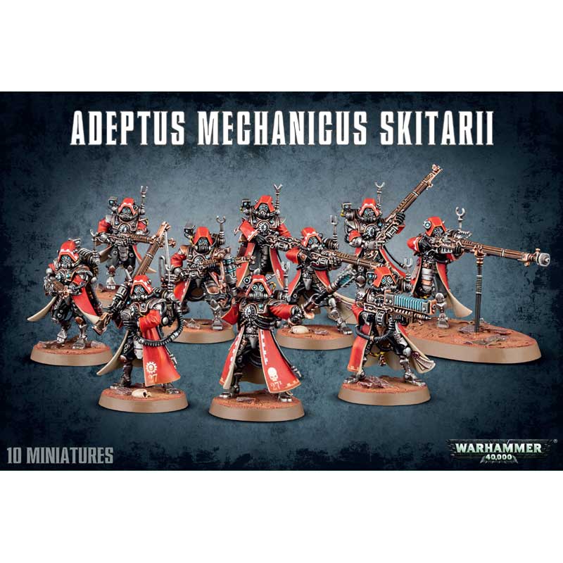 Harnessing the energies of forge worlds within their curious weaponry, the Rangers of the Skitarii are implacable and relentless hunter-killers. For them, an engagement is not over until their enemy is destroyed - even if this means stalking them across galaxies and over decades.Skitarii Rangers, featuring cowls and gasmasks, stalk their prey with galvanic rifles. Each trooper is sealed in heavy, industrialised Skitarii warplate, emblazoned with the symbol of the Adeptus Mechanicus, bristling with data-collecting sensors, antennae and environmental monitors. Mindful of the harsh terrain of Mars, their legs have been removed from the knees down, with bionic replacements lending each model an air of cold, cybernetic augmentation
